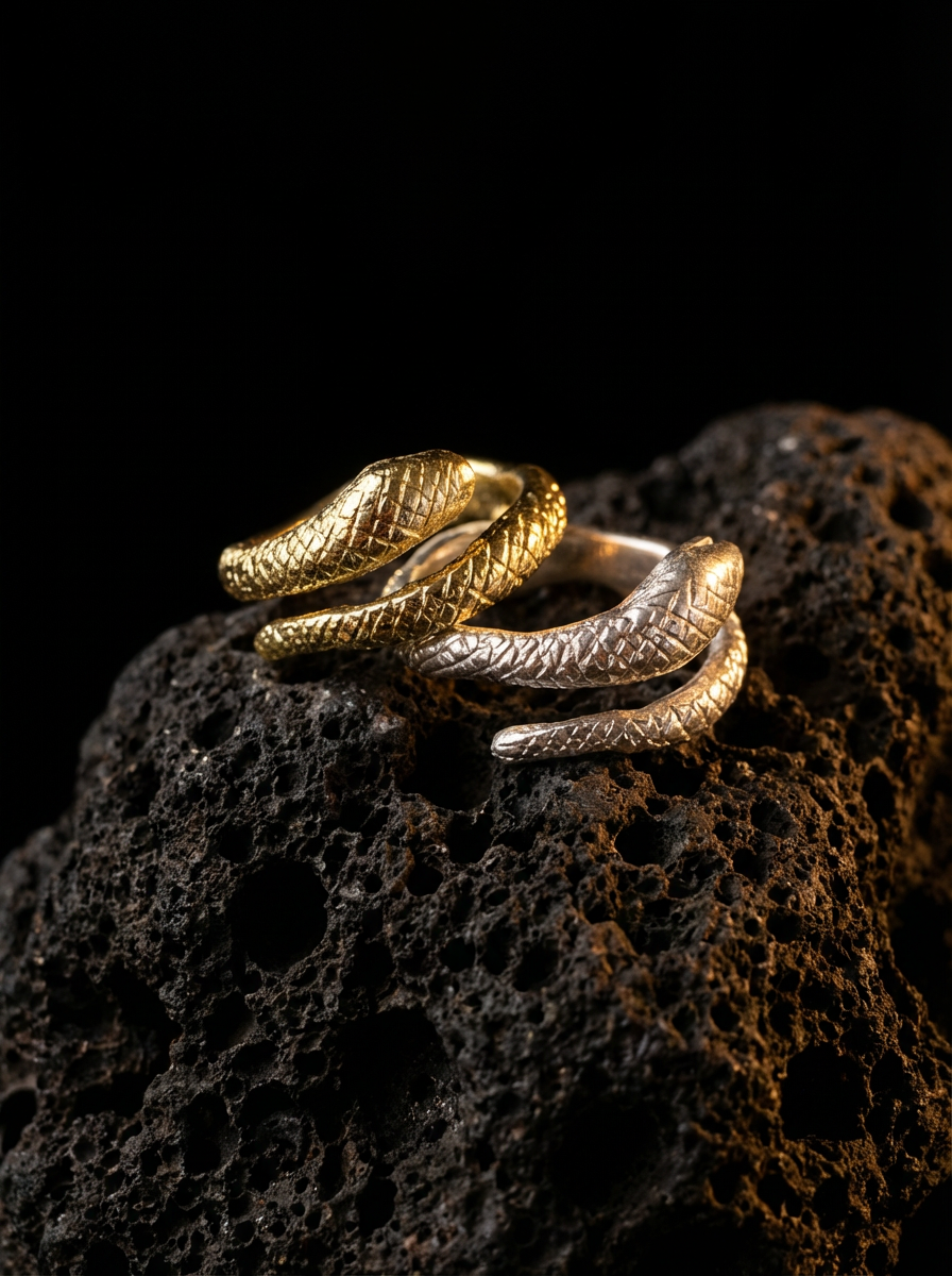 Anillo de diseño de serpiente. Neithéa simboliza la renovación, los nuevos comienzos y los ciclos que se transforman sin perder su esencia. Es un amuleto que protege y renace contigo, una ofrenda a la belleza del universo, una memoria brillante de aquello que nos trasciende.