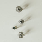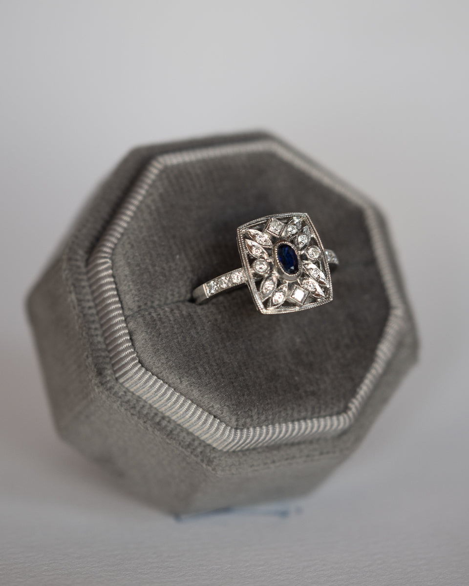 Piedra principal Zafiro Oval central de 5x3,5mm. Acompañado de 2 diamantes corte princess de 2x2mm, 2 diamantes corte brillante de 3,5 puntos y 8 diamantes corte brillante de 1,5 puntos. Además, tiene 6 diamantes corte brillante de 1,5 puntos en la argolla.
