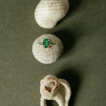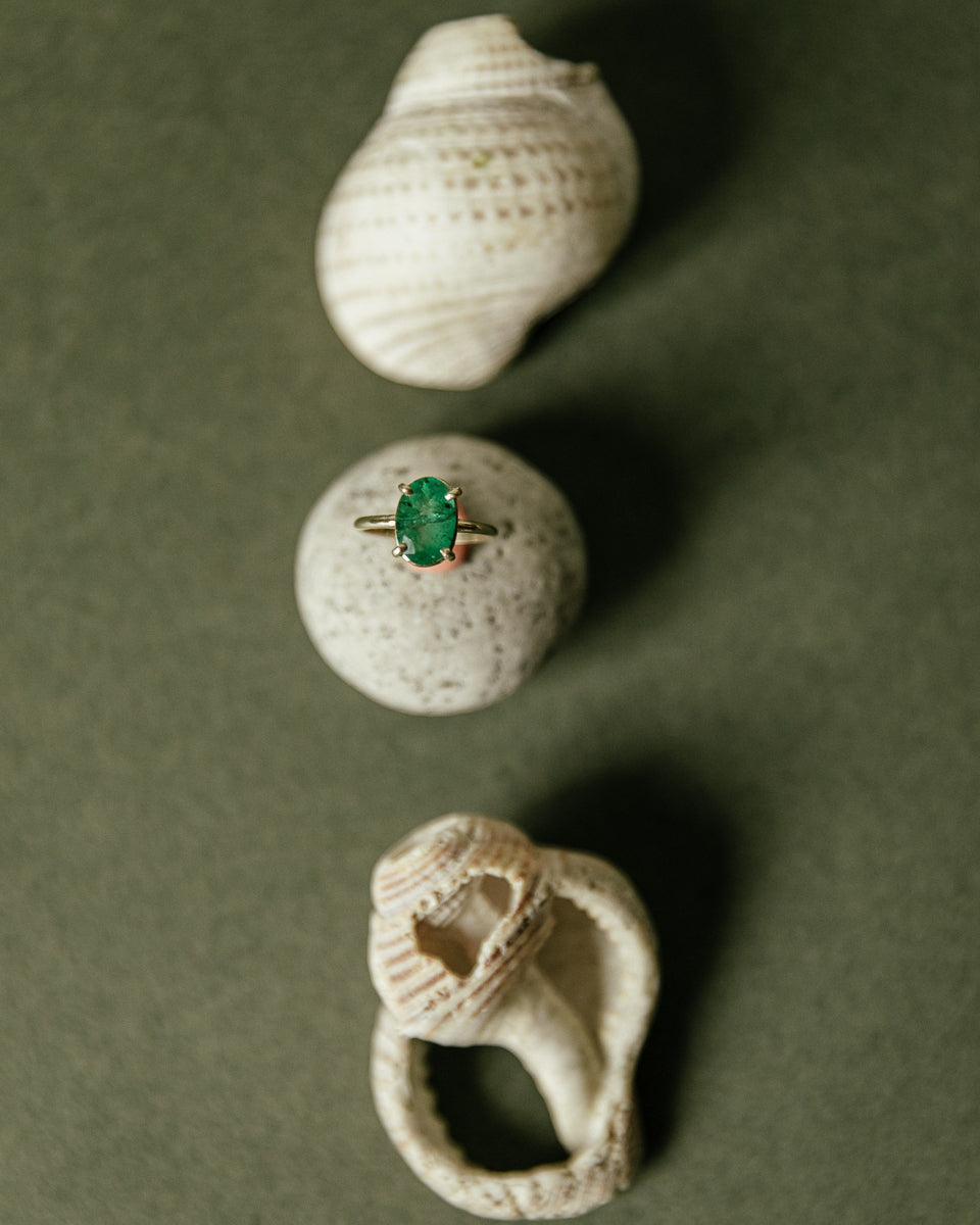 Anillo hecho a mano con una piedra de esmeralda oval de 2,06ct, engastada en un canastillo y argolla de oro amarillo de 18K.