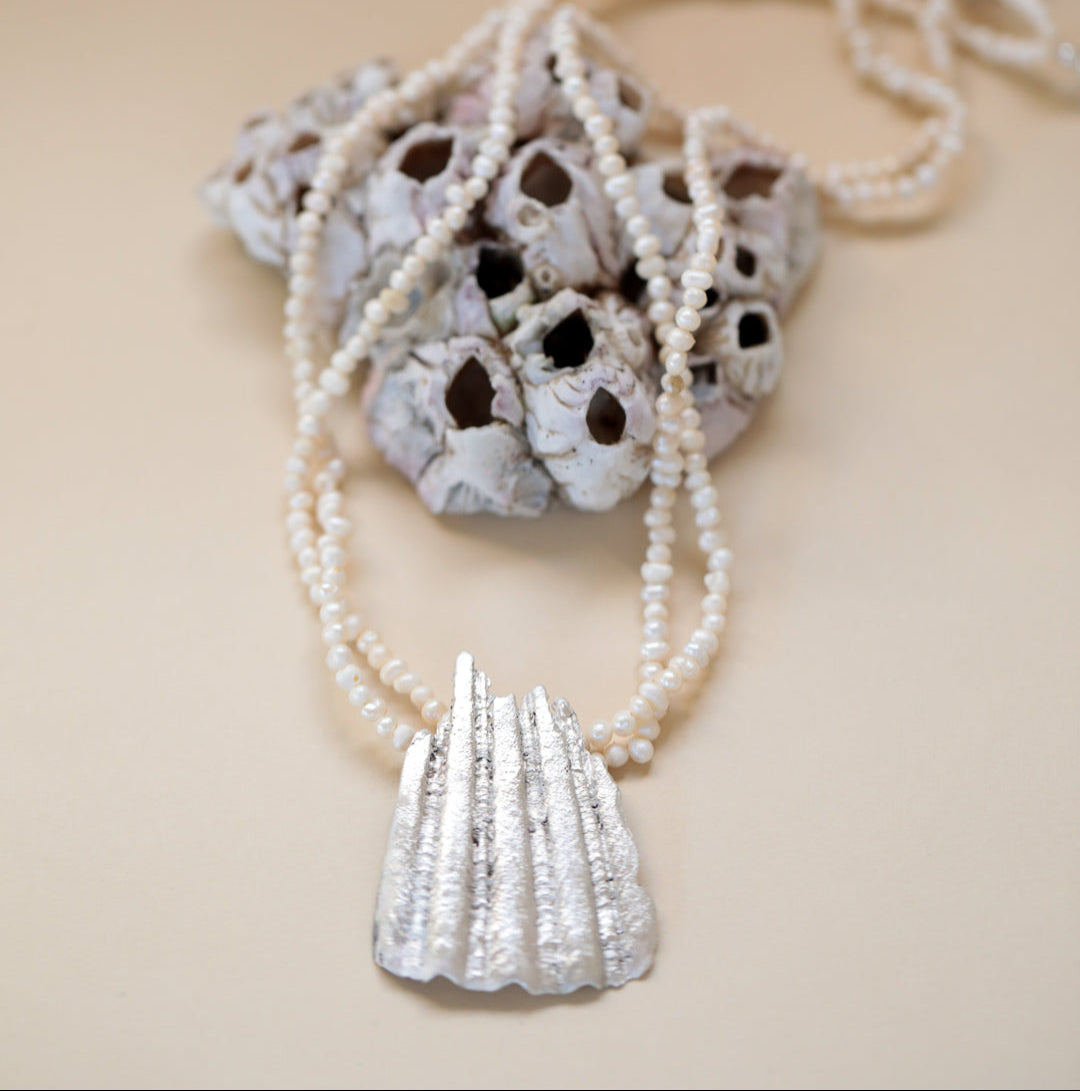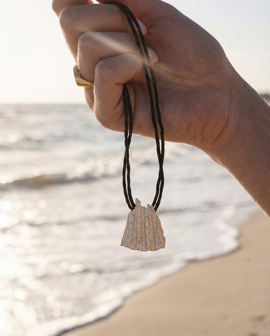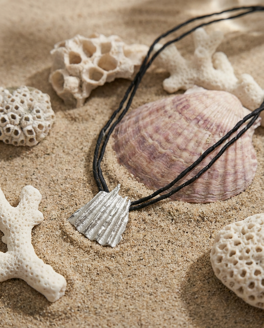 Collar de seda con concha natural de nuestra costa central llevada a un colgante de plata 950.