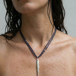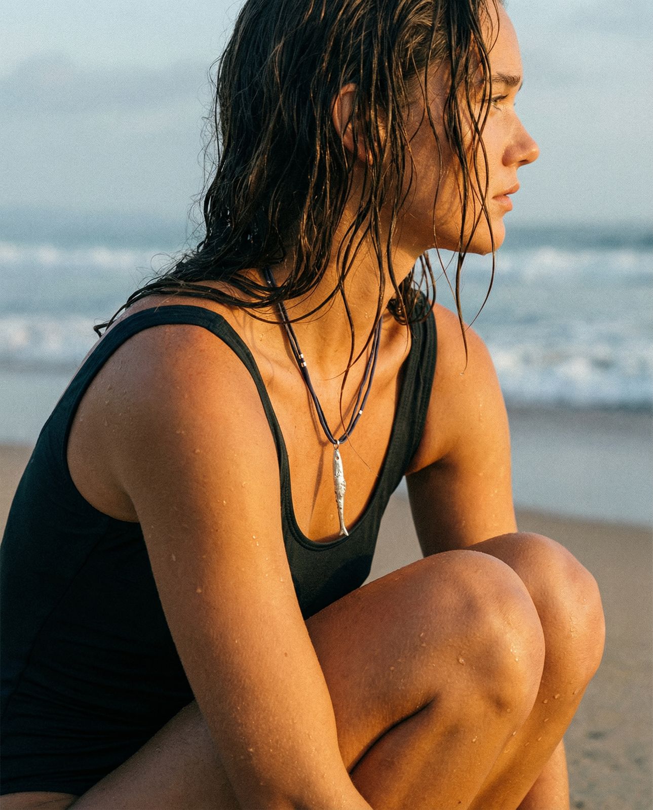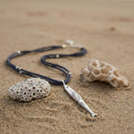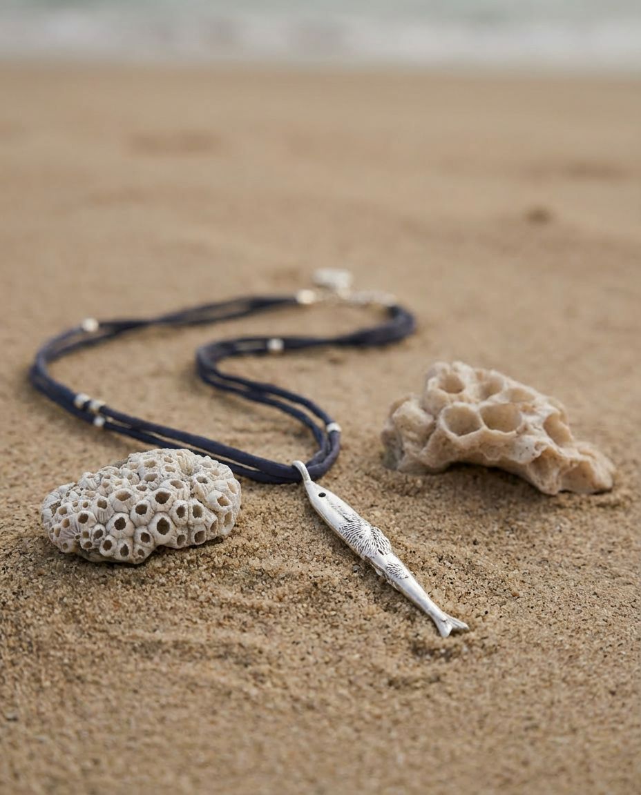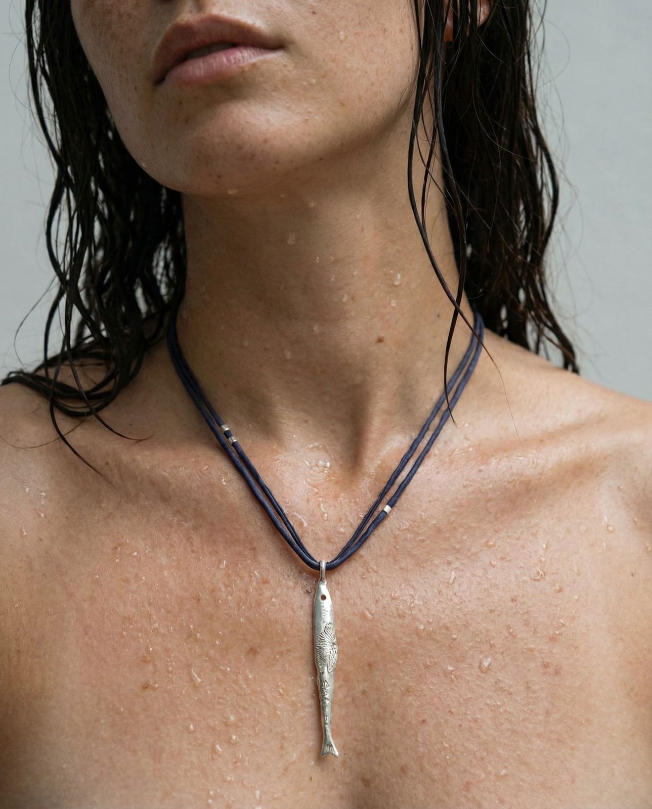 Collar de seda con pez tallado a mano y textura natural en plata 950 con ojo de piedra de zafiro.