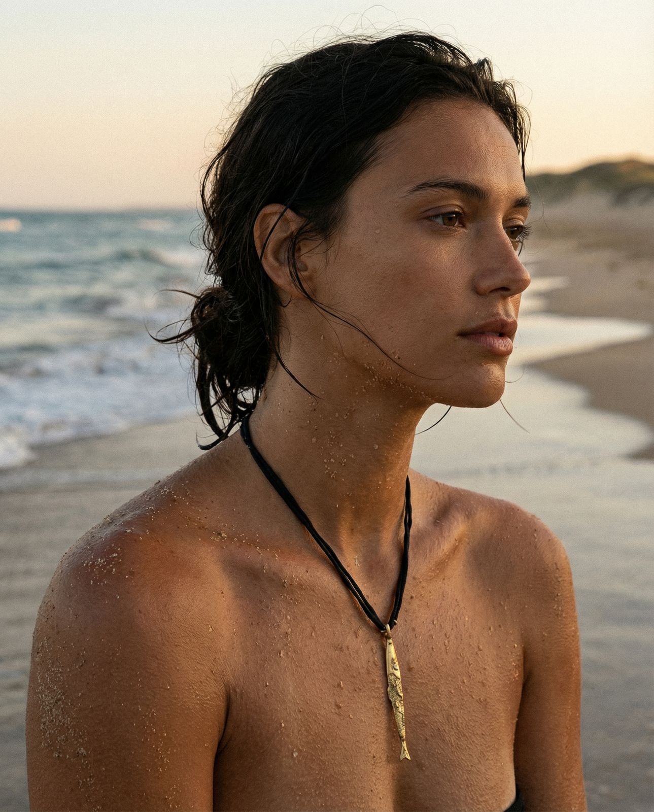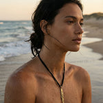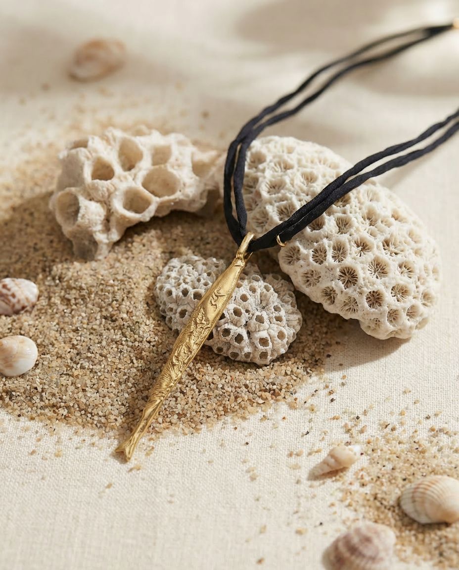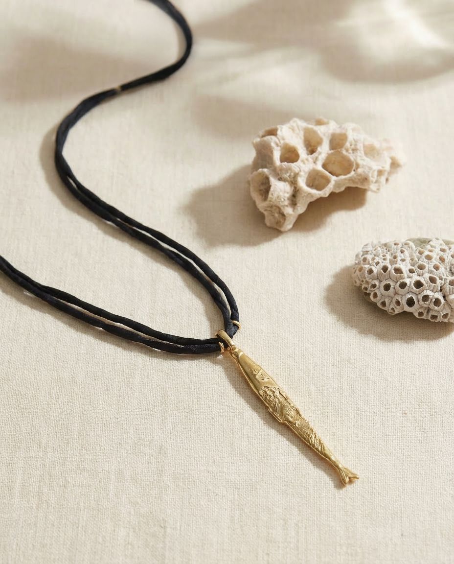 Collar de seda con pez tallado a mano y textura en bronce natural.