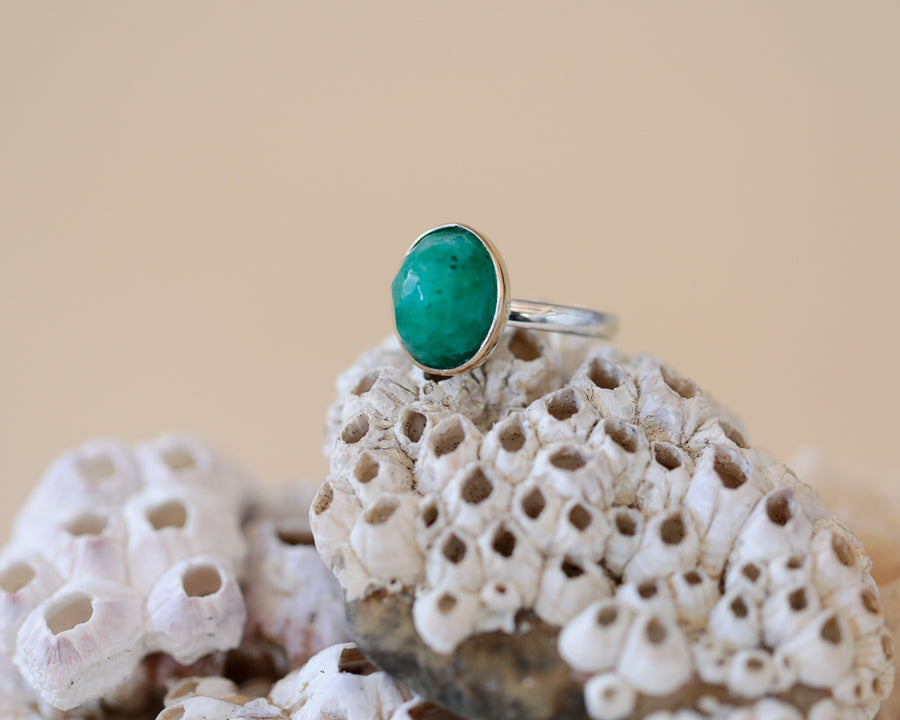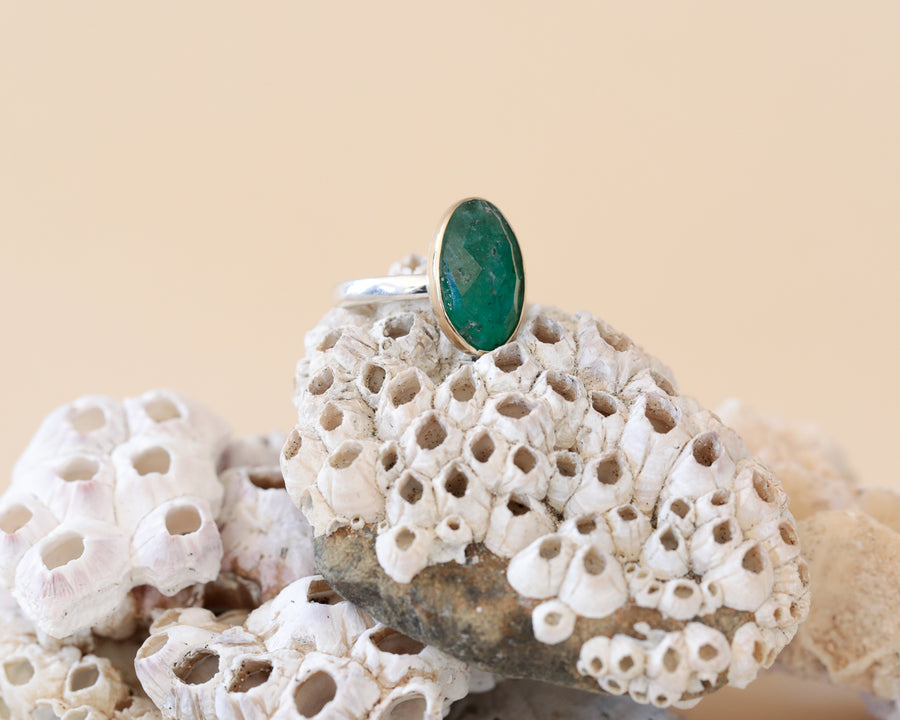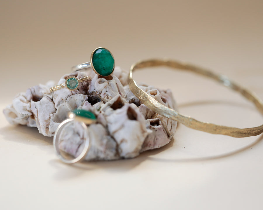 Anillo Rina, argolla de plata 950 y una piedra central de esmeralda colombiana engastada en bisel de oro amarillo 18K.