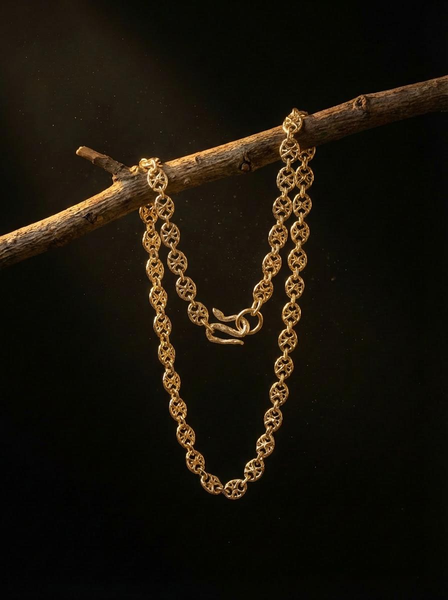 Collar integrado por eslabones estrellados de confección bruta, unidos mediante un broche de serpiente. Esta composición genera una pieza con presencia táctil y visual pronunciada, caracterizada por su acabado sin refinar y estructura geométrica definida.
