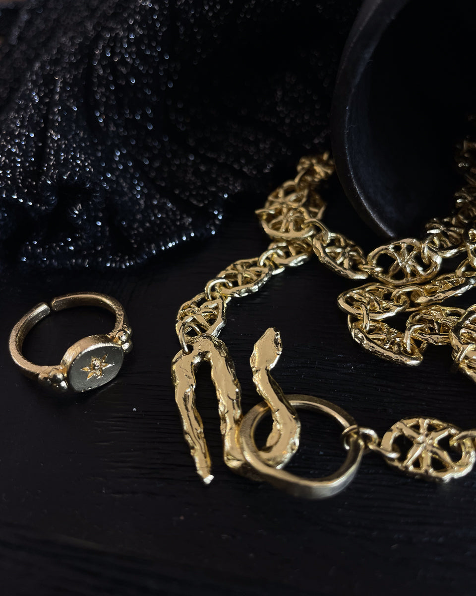 En Neithéa, cada joya es un cruce de energías que dialogan. La serpiente representa la renovación: ciclos que se reinventan sin dejar atrás lo esencial. Las estrellas guardan una luz antigua que nos recuerda la inmensidad del universo y esa fuerza que permanece más allá del tiempo.