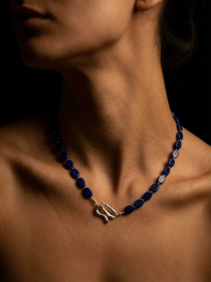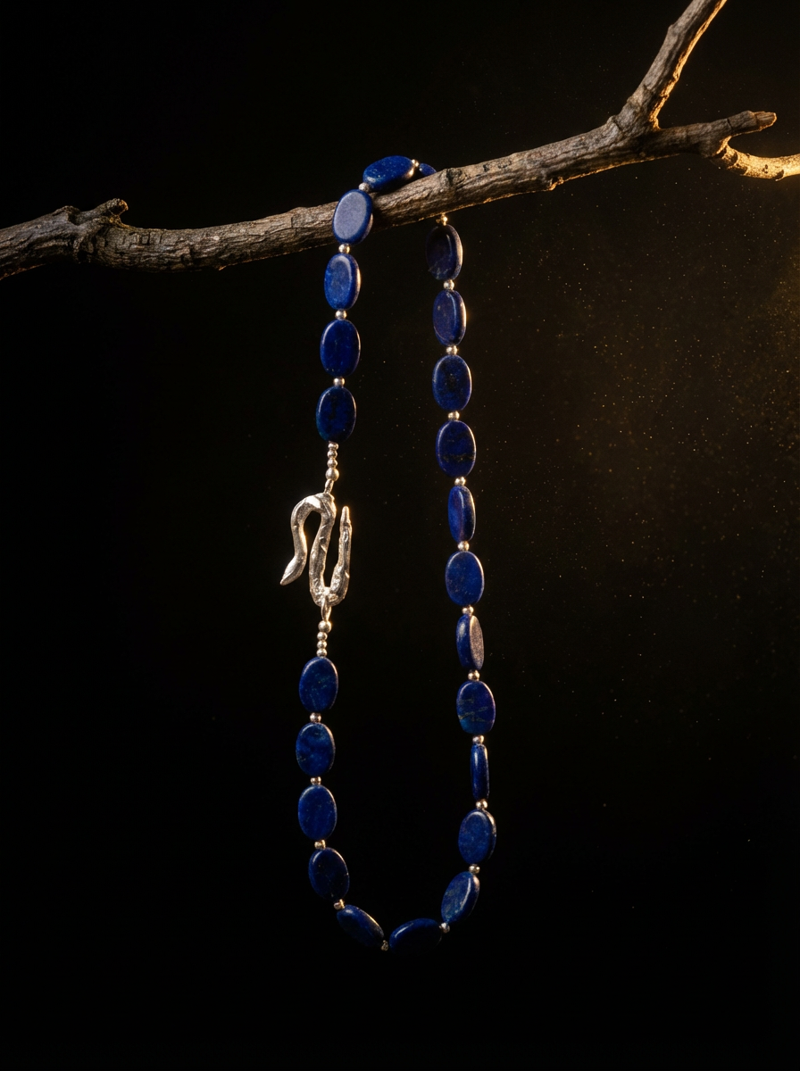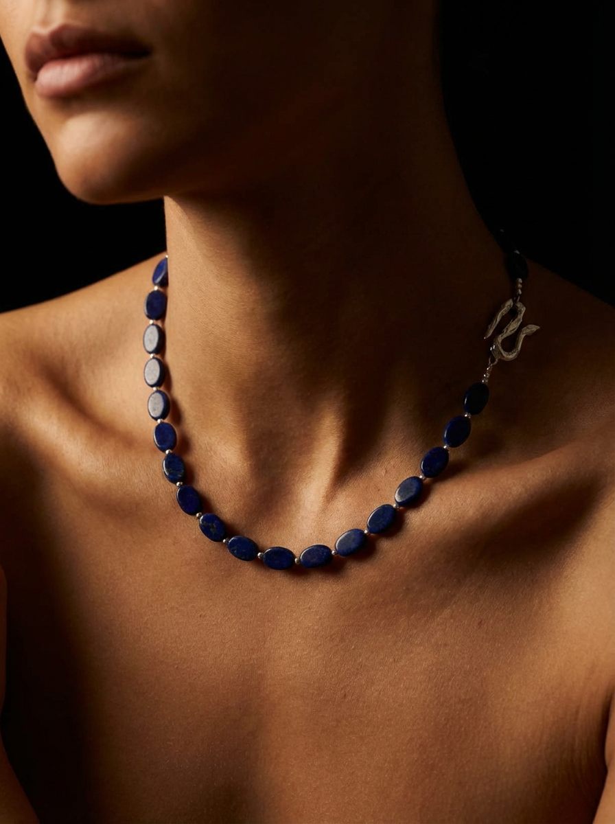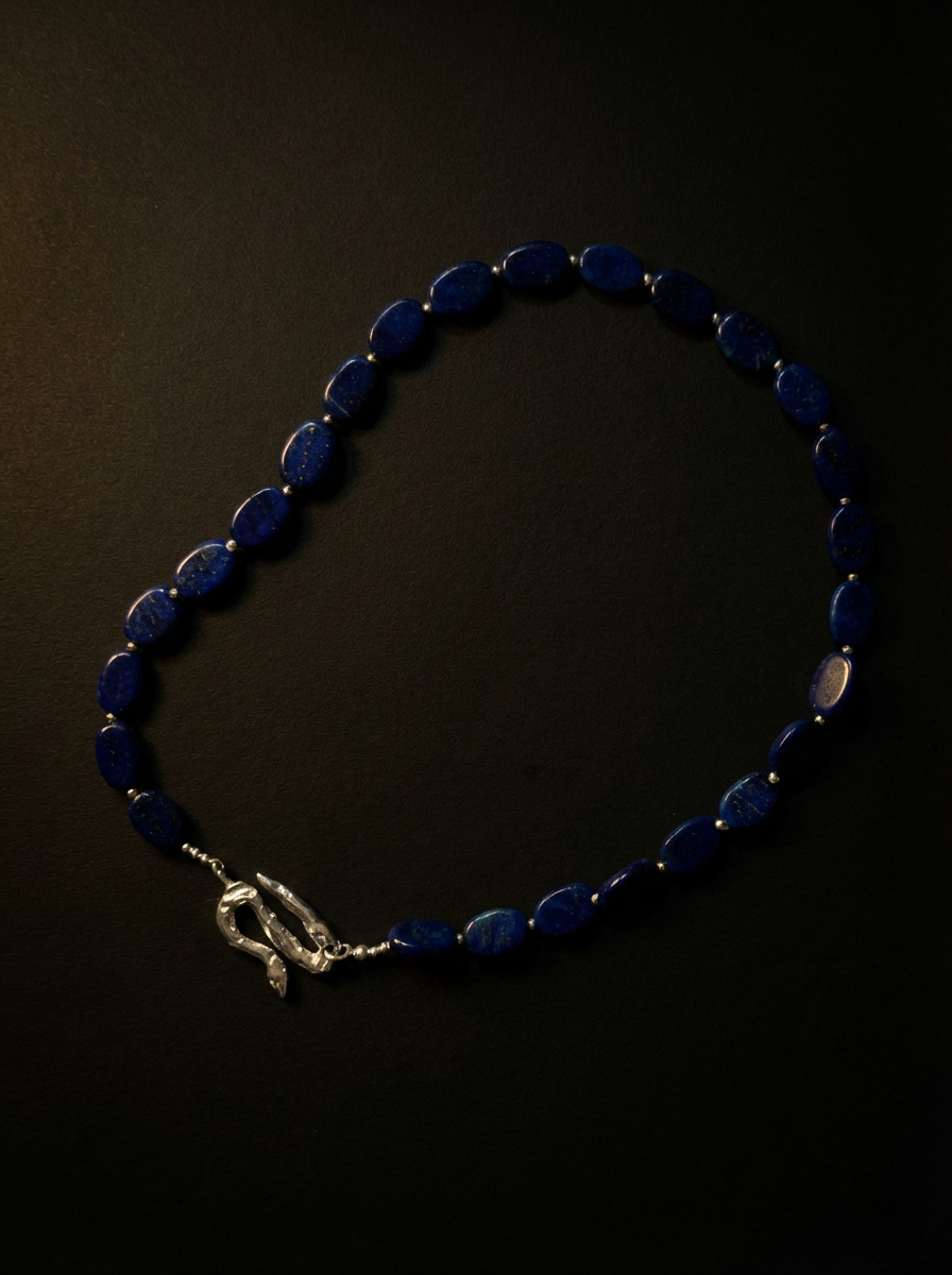 Collar de piedras Lapizlazuli ovales planas, unidas mediante un broche de serpiente.