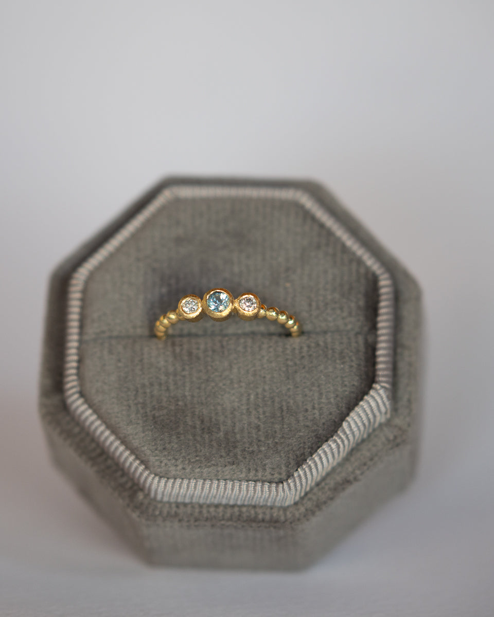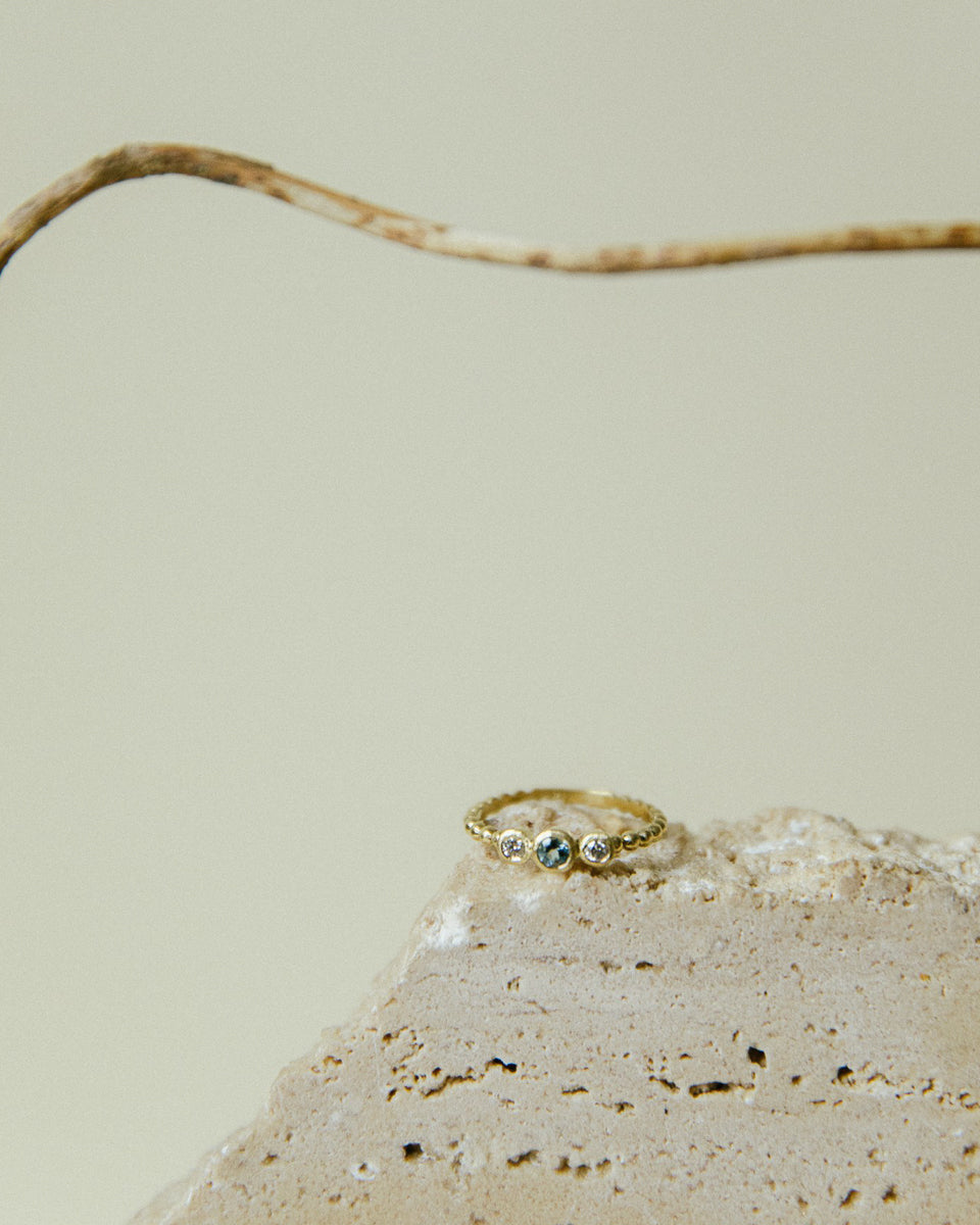 Piedra central de Aguamarina natural color Santamaría de 3mm, acompañado de 2 diamantes corte brillante de  6 puntos cada uno. Todo ellos engastados en Bisel.
