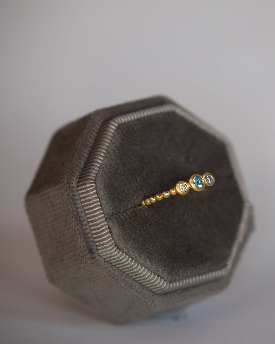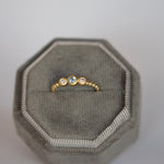 Este fino anillo presenta tres piedras centrales en una argolla decorada con bolitas, siendo un accesorio esencial para quienes aprecian los anillos de estilo pequeño y delicado.